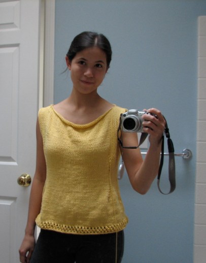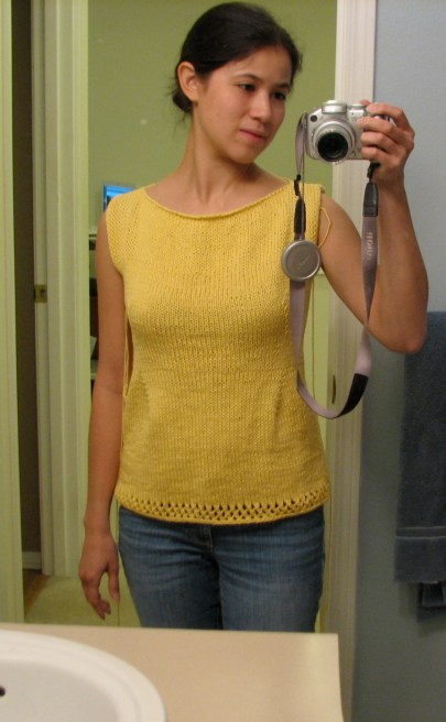 Now the body of the sweater fits more snuggly. The front cowl does not drape as much as it the pattern suggests it should, but I like boatneck collars just as much. And the tighter fit allows me to layer this under jackets. After a couple experiments with the sleeves (I don’t have enough yarn to make 2 elbow-length sleeves), I think I will keep this sweater sleeveless, perhaps with just the lace trim added to the armhole edges.