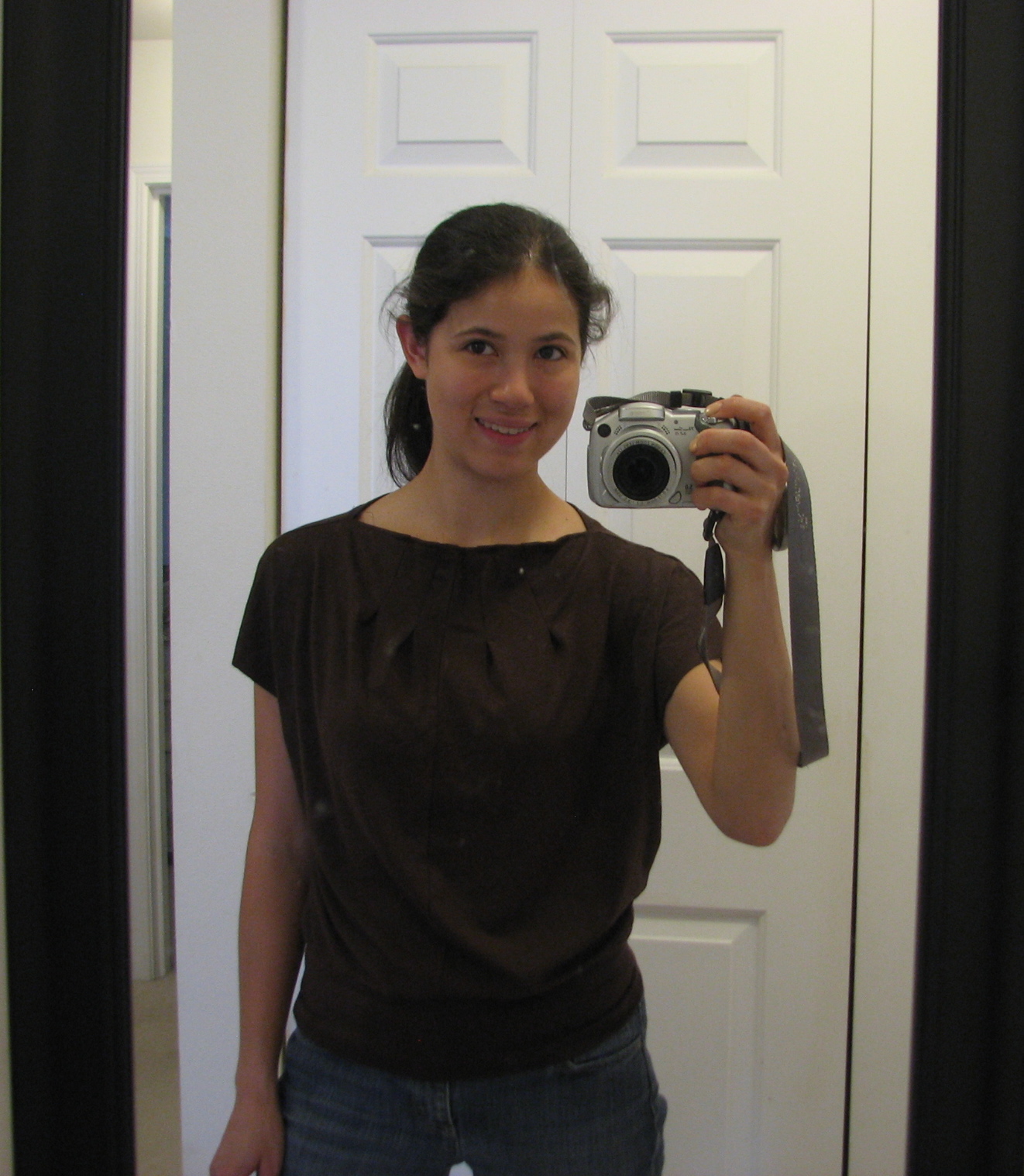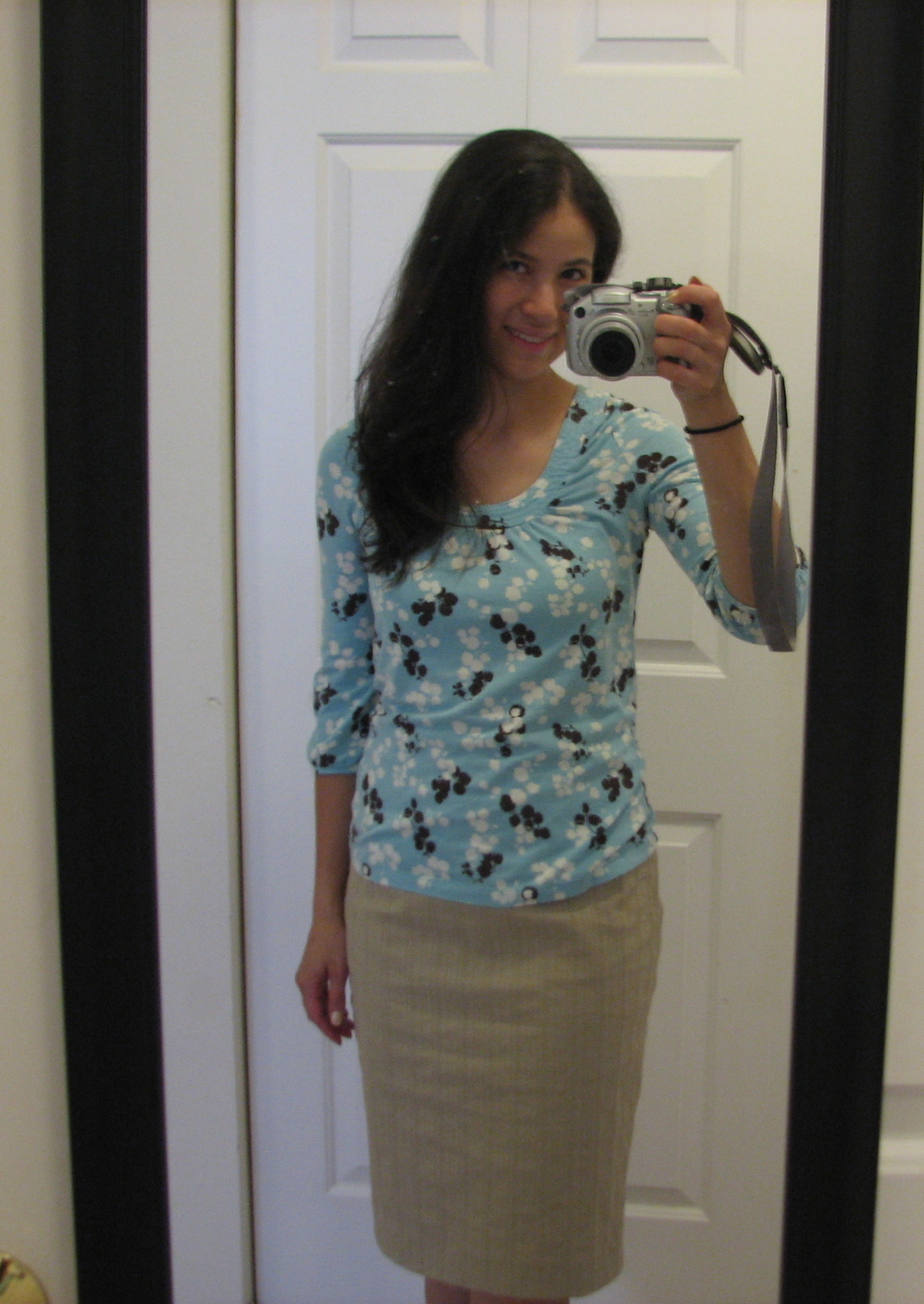Knit shirt:Â The knit fabric (similar to swimsuit or yoga pants) was provided by our instructor. The pattern was drafted by me (according to the instructors lesson). I plan to wear this under some of my short-sleeve cardigans or blouses in the cooler months. I just ran out of days to wear this.