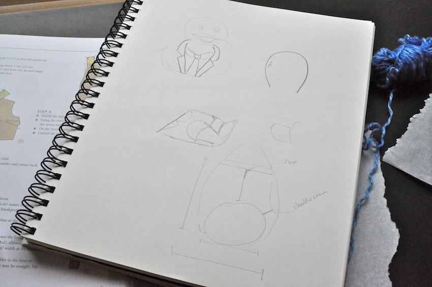 I turned to one of my pattern making books for collar inspiration, doodled a couple of sketches, and then started taking measurements from a duck I had from the 2011* Duck Hunt. (*This detail will be important later.)