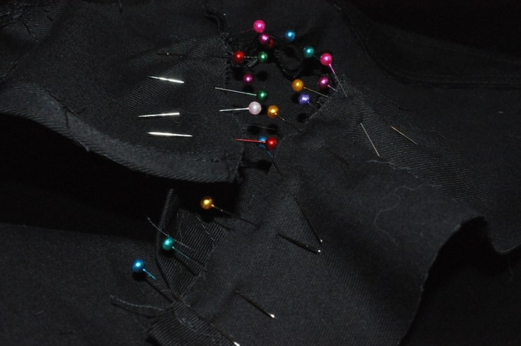 The difference wasn’t big enough to force me to restart from scratch, but when it came time to sew on the sleeve pieces, I made the seam allowance bigger than originally planned (3/8″ vs 1/4″). I am glad that Greg’s Assassins Creed costume involved a lot of curved pieces, because this wing sleeve required a lot of pins to set it into place. At this point, I am a pro at this.