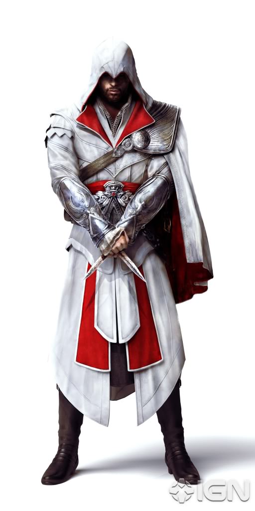 NOTE: there are a few variations between the opening cinematic, the initial promo images of Ezio (presumably before the game was finished), and the in-game play. For example, Ezio’s undertunic is split in the back in some illustrations and unsplit in others.