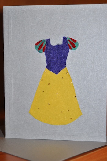 To get myself started, I simultaneously made a 60th birthday card for my mom and began to whittle down my collection of tiny and misshapen fabric scraps. It is not a sewing project, but it is well within the limits of fabric alchemy. As an adult, Snow White is my least favorite Disney princess. However, when I was 4-years old my mom made me a Snow White dress for Halloween, with a stand-up (sorta) collar and a red headband. I looked adorable. Looking back, I feel that this dress symbolizes my connection with my mother through sewing. I hope she will feel the same way.