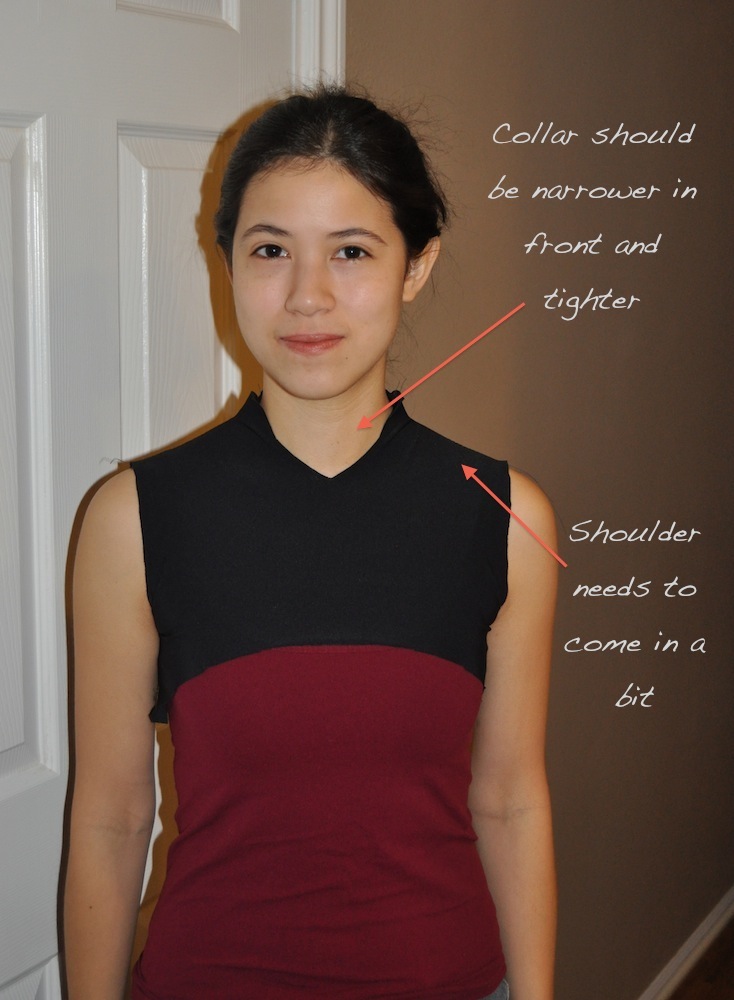 After a good night’s sleep, I was ready to create a partial muslin of Korra’s shirt. The morning started off a bit rocky, with my sewing machine getting tangled and jammed in the spandex. But I rethreaded the machine and it seemed to work nicely after that. I had to throw on a camisole to take pictures of the muslin for “coverage reasons” and ended up looking like a Star Trek: TNG wannabe.