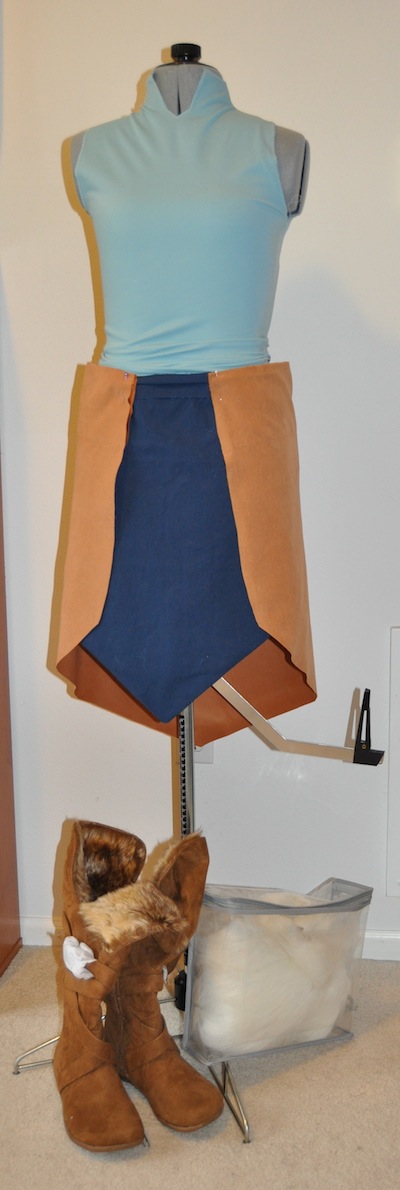 Now that I have everything together I can see that the skirts do appear to be a little longer than they should. Concept art for Korra shows the points of both skirts hitting mid thigh. But it is better to cut back than try to add length, which is a problem I just ran into on the costume I am making for Greg. I am waiting until I complete the pants (still looking for that perfect gray fabric) before making any length adjustments to the skirt. I want to try it all on together and see how it drapes with all of those layers.