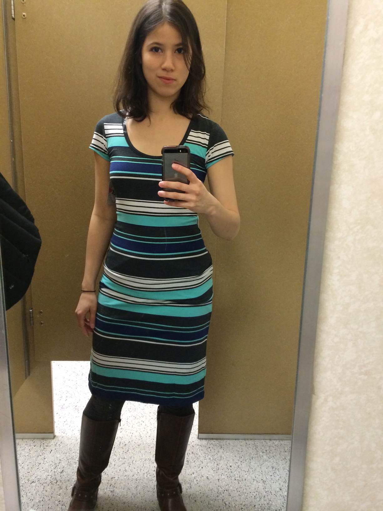 It fits, it’s cute. But it also looks very young and has a 1990’s vibe to it. I wouldn’t feel comfortable wearing something this clingy to work.