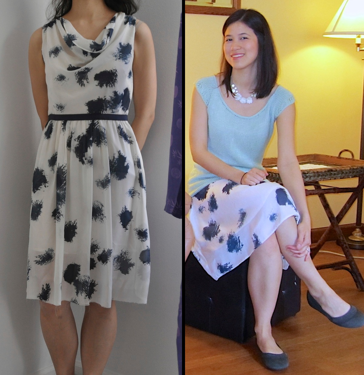 Why I changed it: Originally the hem of the trendy bubble skirt hit mid-thigh (exhibit A: the original white lining in the left photo). This was too short for me. I look best in skirts that brush the top of my knees. Originally I intended to just re-hem the skirt and keep the garment as a dress. I like cowl necklines, but this particular bodice was not flattering on a small chest. It was too loose and I felt lost in the fabric folds.
