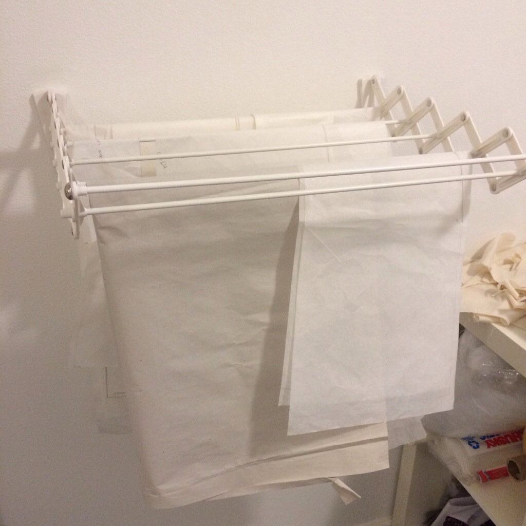 I installed it last night (with supervision and drill-support from Greg) and have hung up my patterns-in-waiting. I’ll let you know how this mounted drying rack works. It is plastic and the dowels feel a little flimsy, but I am just hanging tissue paper.