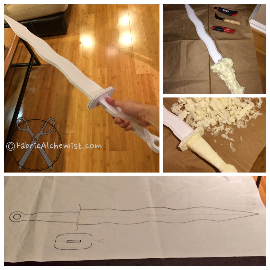 Sword – Self-drafted pattern based on movie animation, foam board, spray insulation foam, fast mache, plasti-dip, and spray paint. X-acto knives, sandpaper, and paint brushes were my only tools. Read the full tutorial and get the template here.