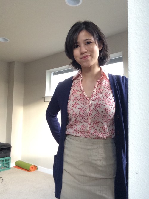 This skirt is another self-drafted garment, one that I made three years ago during a pattern drafting class. I would like to make a new pencil skirt in a different color. This one is fine, but the color is kinda of blah. I bought the stretch twill thinking this khaki would go with everything, but it is almost too neutral to pair well with anything but bold colors (which I don’t have a lot of…yet). It would have been better if it were white. If I am going to wear something form fitting, I want it to pop. Or at least look sleek.