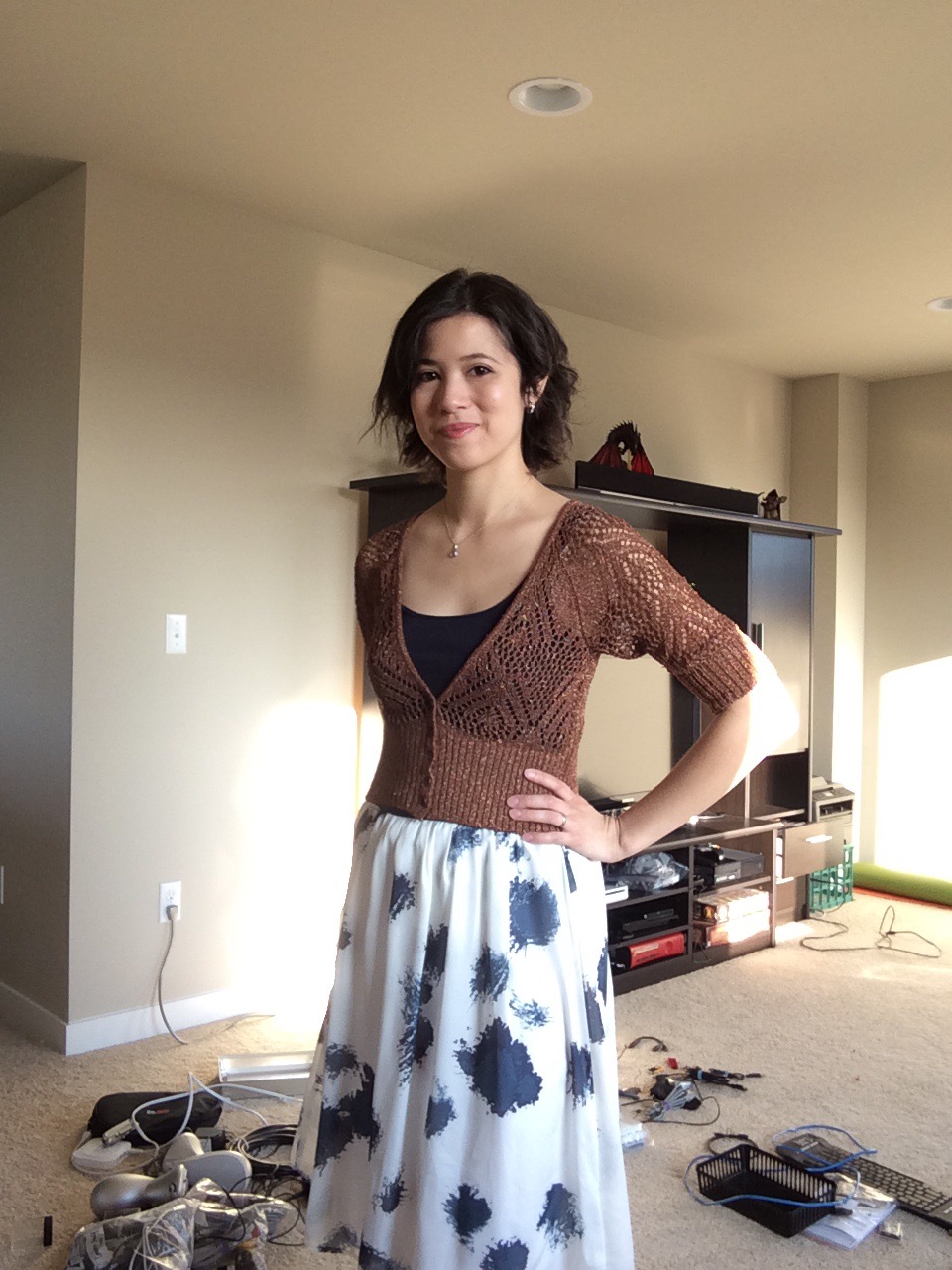 I love this sweater! (Breakwater pattern by Winged Knits on Ravelry.) I love these thrifted pants! The sweater itself is not quite cropped but is shorter than most sweaters I tend to wear. The hem skims the top of these low rise capris and I prefer more coverage around the midsection, especially when I am at work. I did make this sweater to be worn with airy skirts that have higher waistbands than these pants. In that sense, this sweater is as it should be (according to the pattern). The fit is great overall.