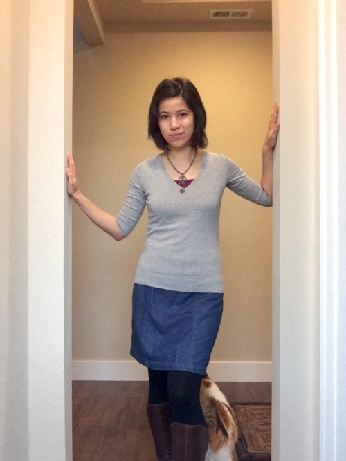 I like having a lightweight denim (probably technically chambray) skirt. It is best on warm spring and summer days. I can wear it with tights or leggings (as seen here), however the thing fabric catches on the leggings and rides up constantly. I would like to redo the waistband to fit more snugly and I should finish the end of the side zipper so it stops scratching my leg.