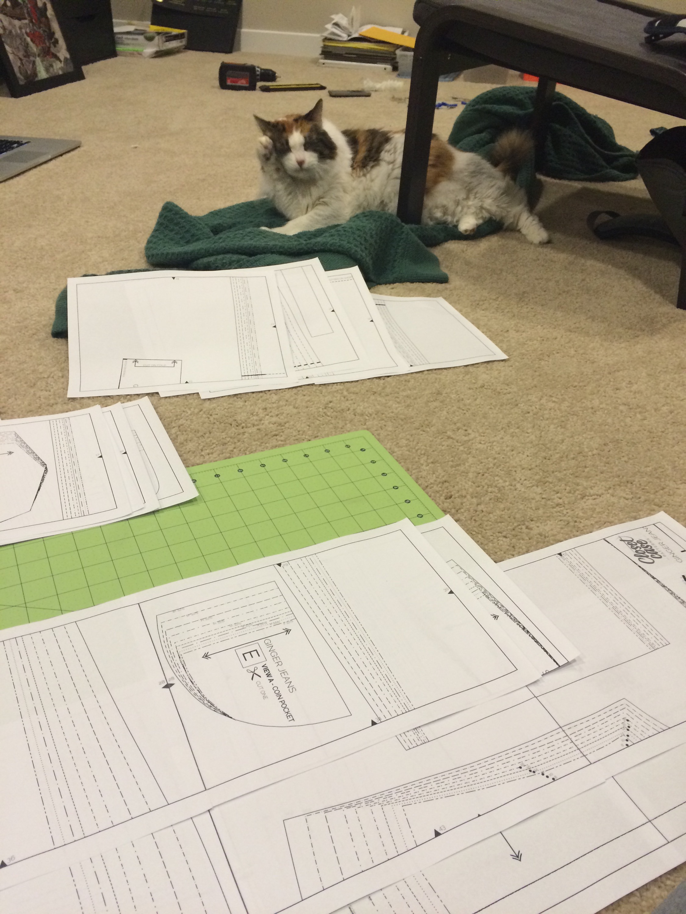 And making warmer clothes is exactly what I am doing (or trying to do). You are looking at the partially taped together Ginger Jeans pattern, view A.