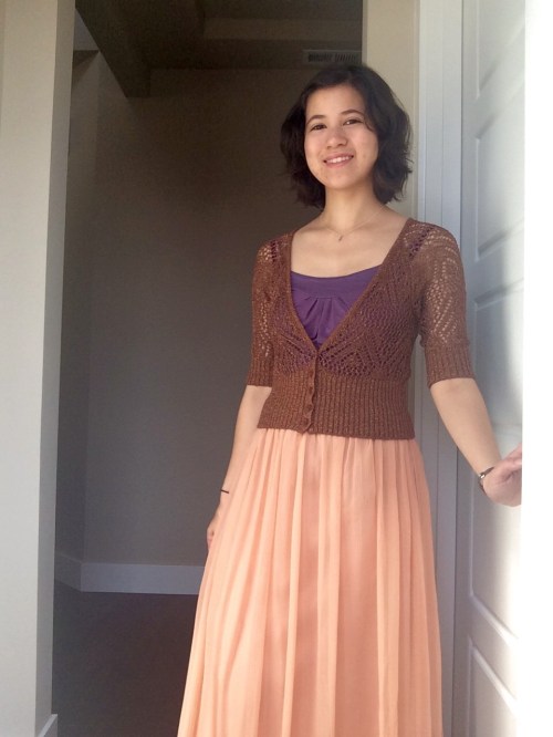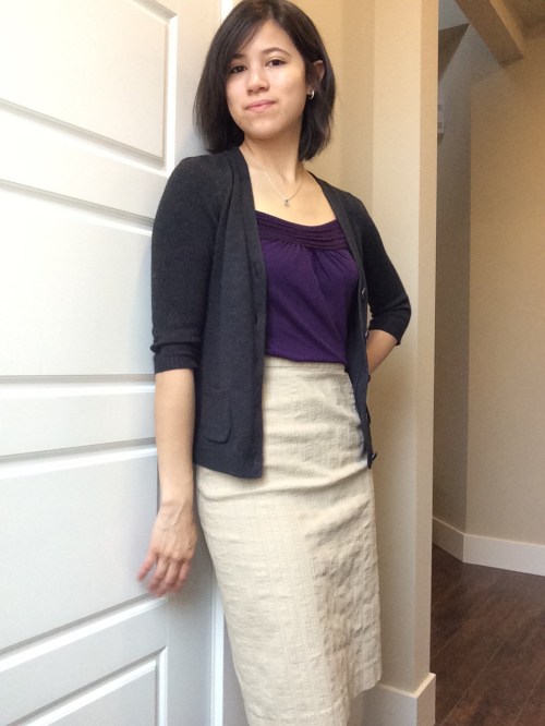 Somehow, even though the skirt waistband is the same height, my torso looks longer with the purple camisole. The knit jersey drapes and clings a bit more, while the cardigan is more structured, contributing to a bit of a tailored look.