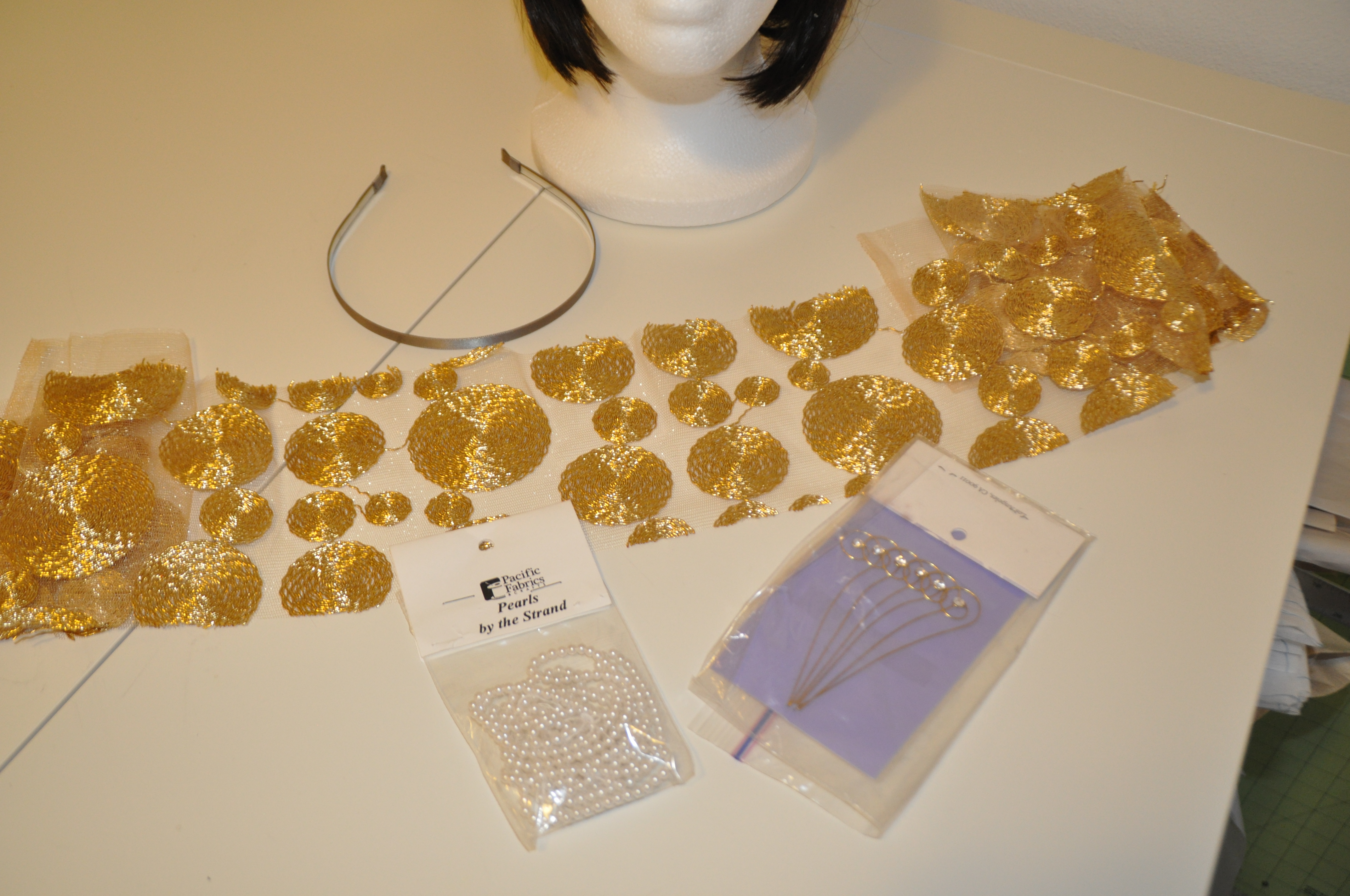 I dug through my stash and found the gold curly notions in the lower right corner. Then I went to Pacific Fabric’s Northgate store to look through their fancy fabrics. For $2 (they let you take as little as 2 inches of the super fancy fabrics that would cost $25 per yard), I came home with a strip of gold medallions.