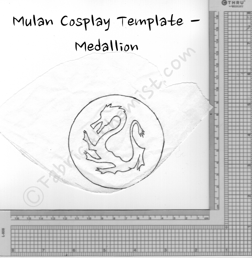 Sizing Tip – Use your own body as a measuring device. Mulan holds the medallion in her hand, so I cupped my palm, measured the diameter (3 inches), and then enlarged the reference image in photo editing software until the medallion was 3 inches wide.