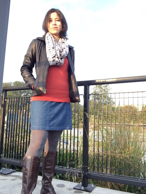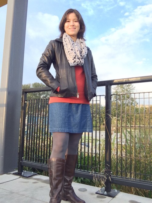 1. I’m glad you did this post! I’m totally nosy, so it’s fun to see how your dress for work and what your area is like. That orange sweater is great on you, and I like your denim mini refashion. Win!