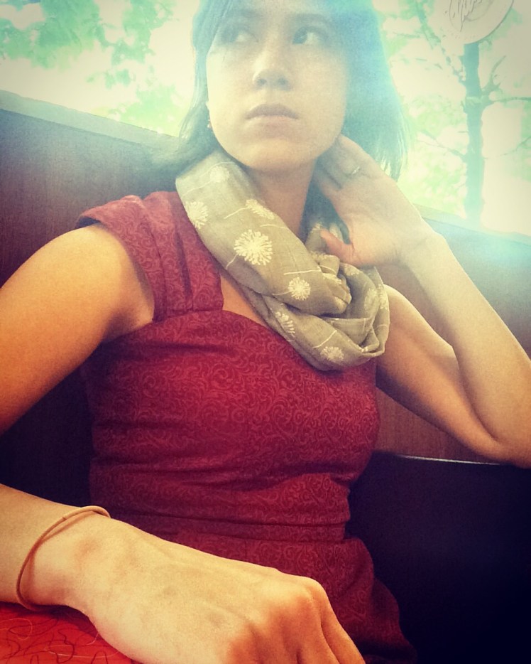 Back to work after a too-short weekend. This was an all-me-made outfit: Cambie Dress, Pearl(ish) earrings, and gauze infinity scarf (unblogged). I enjoyed mixing the monochromatic patterns of the dress and scarf, both are somewhat floral-based. I am not sure this is the best scarf look for the sweetheart neckline of the Cambie Dress.