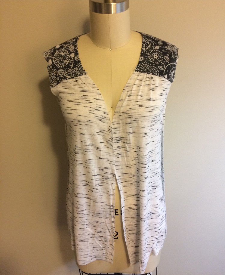 - Instead of sleeves I made armhole trim from the main fabric. I did not encase the raw edges like the rest of the pattern had with the the yokes. After serging, the seam was pressed toward the trim. (After wearing it, I think I will remove the armhole trim.)