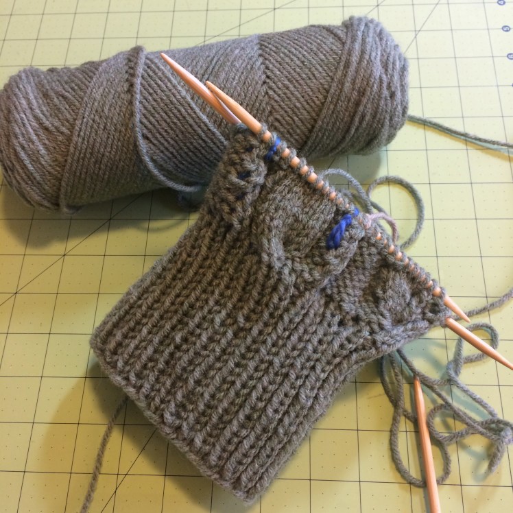 I’m using free yarn I took from home, a discontinued Red Heart line of yarn called “TLC Heathers“. It is 100% acrylic and scratchy. I will be lining these with some jersey when I finish.