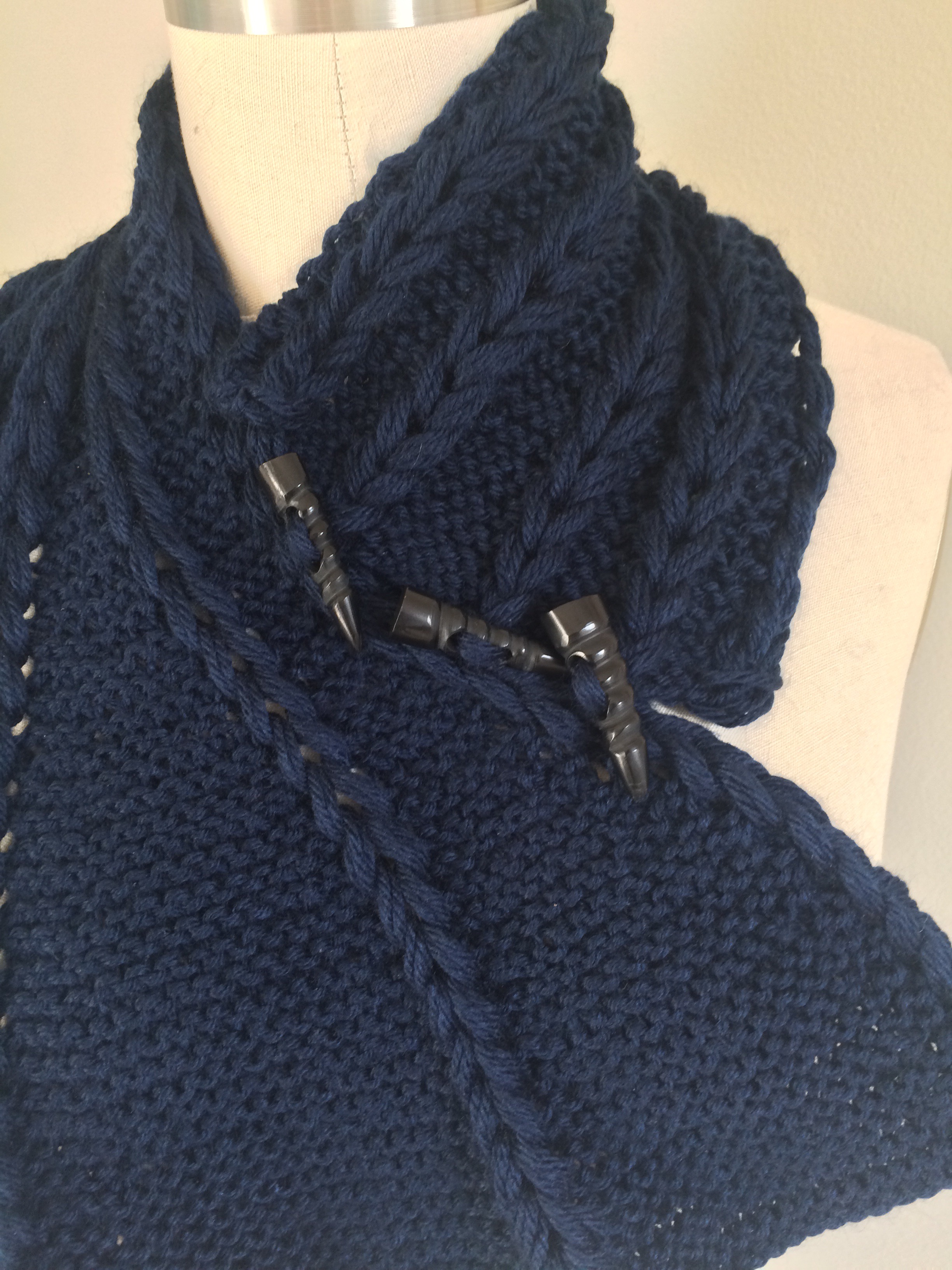 The cowl’s construction is straight forward – garter stitch with increases near the end to fan out the wing. If you are a beginning knitter, I recommend this project. It is a stitch you already know and it gives you a chance to practice one method of increasing stitches. It was a one-skein project for me…just barely. If I had made my cast-on tail shorter, I would have had enough. Thankfully I did buy two skeins.
