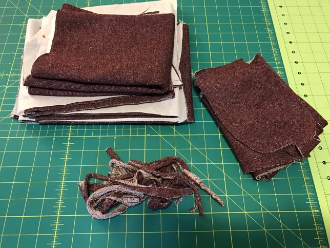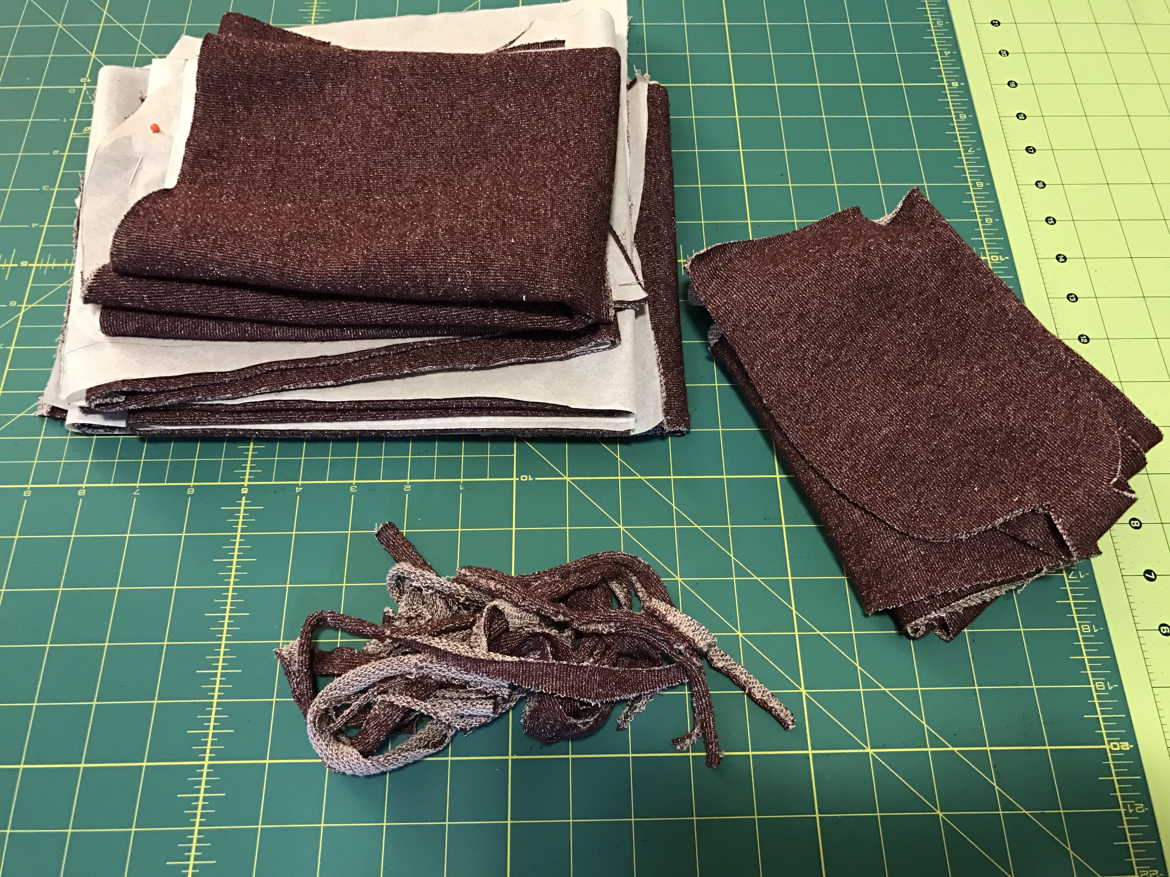 L-R: Cut pattern pieces, fabric scraps that are still useable, fabric waste that is unusable (except maybe as stuffing for a plush)