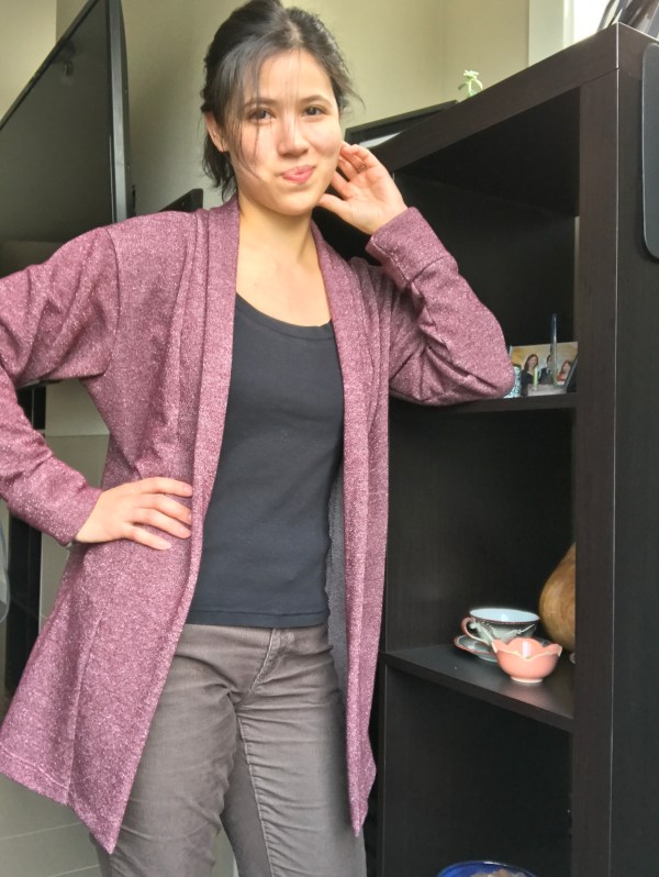I was dazzled by the slight sparkles in this heathered-mauve lightweight sweater knit and originally planned to make it into a Mesa dress (also a Seamwork pattern), but after handling it I knew it would not have enough structure for a fitted Mesa dress. My next idea was a drapey Christmas cardigan to wear over black leggings. (The timing of that didn’t happen, but it is done one month later!)