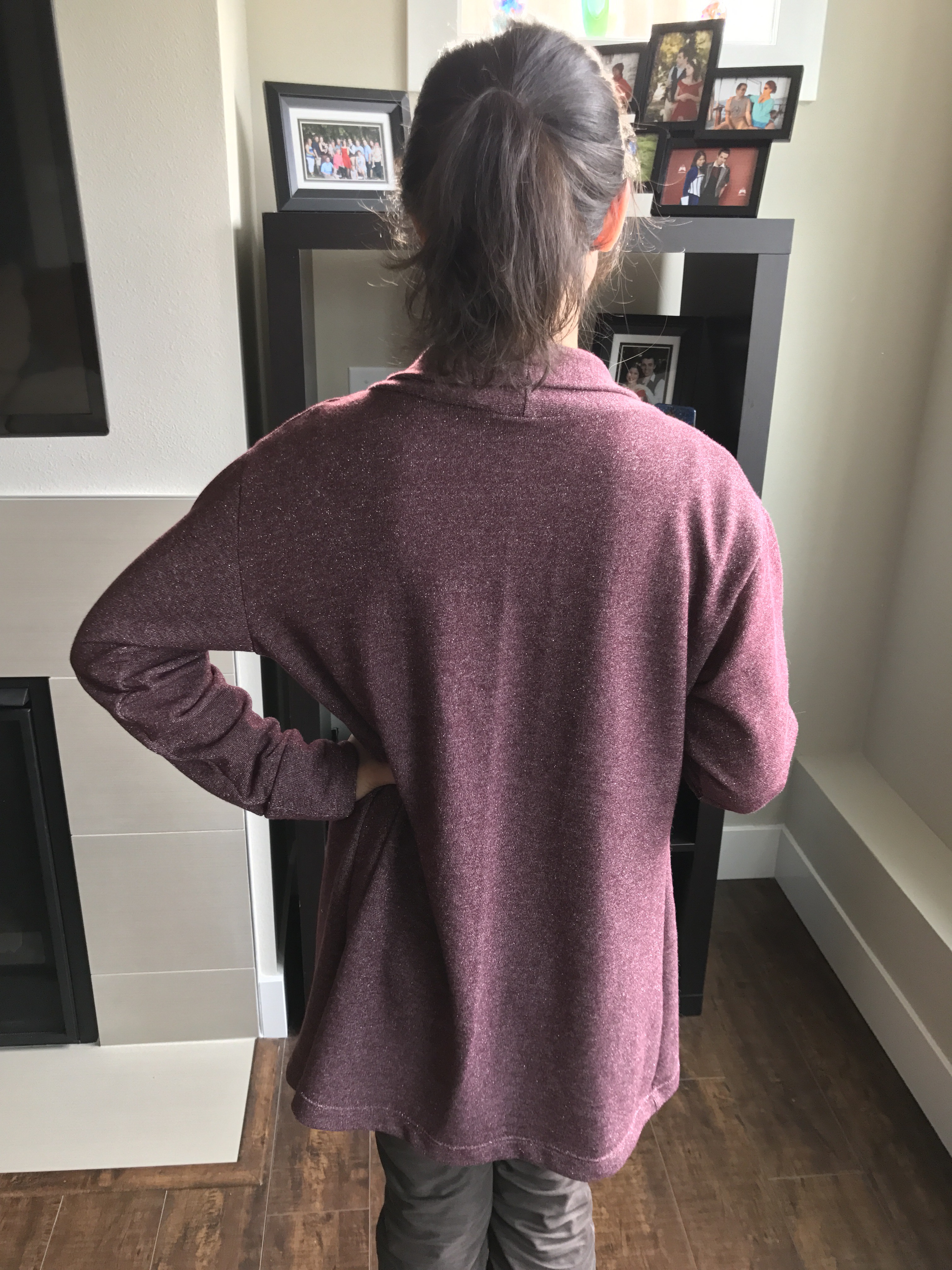 The shawl collar mostly stays folded behind my neck. The dropped shoulders give me a lot of room for movement and because it is lightweight knit fabric, the extra fabric folds don’t impede me. Seeing it from the back reaffirms my decision to choose the pattern size based on my hips instead of bust measurements. There is no awkward tightness around the hips and butt and no bunching at my lower back.