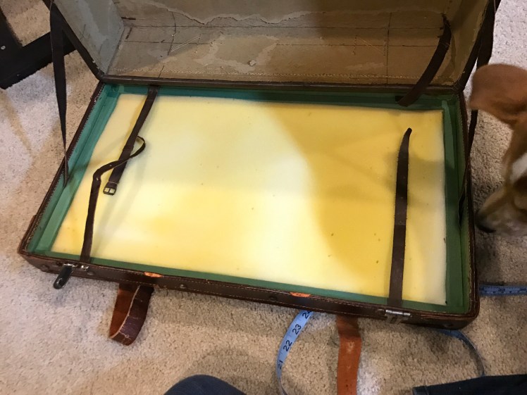 Then I cut out some foam with Finn’s help. This foam will help fill a recessed area in the suitcase lid. (PS – you can see the repaired knitting bowl in the background.)