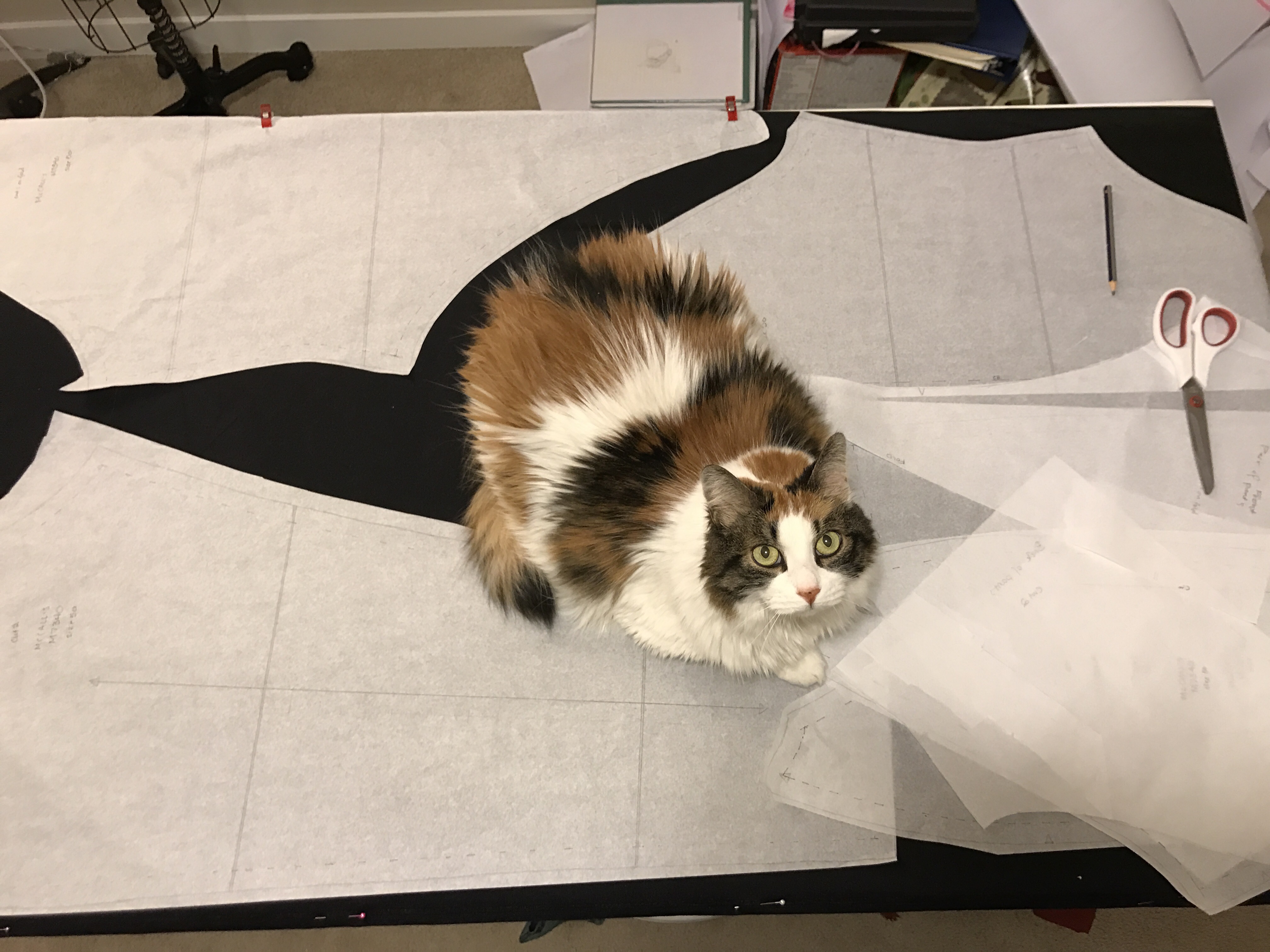 The cat always loved tissue paper patterns. And now a puppy who isn’t fully house trained is traipsing through my sewing room.