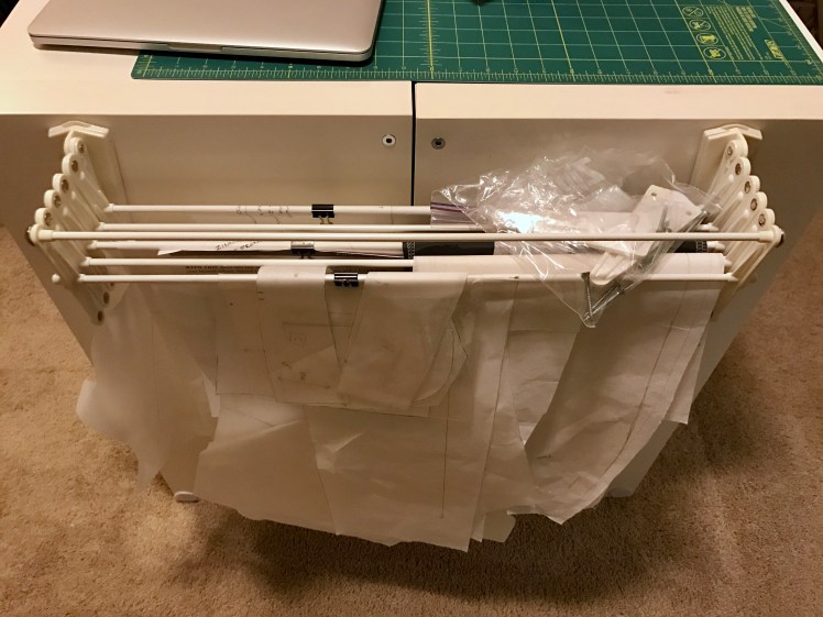 My cutting table is sizable but if I have multiple active projects, I start to run out of room to keep everything in sight. I don’t like to fold pattern pieces I am currently using because folds makes them harder to work with – whether I am waiting for the fabric to finish pre-washing or still the patterns are still being edited through the fitting process. But I can’t leave them draped over my cutting table (I need that for cutting or pinning) and I can’t leave them on the floor.