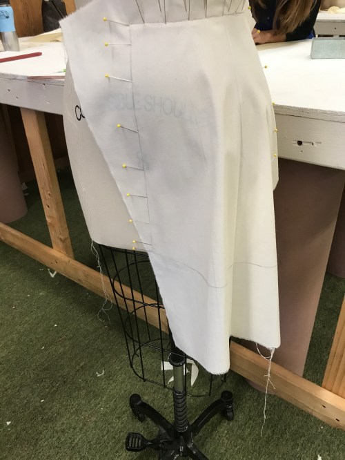 After pinning the CF lower half of the shirt, we were instructed to move in a counter clockwise direction. First pin the waist, then the side seam. All the while, moving the excess fabric up to the shoulder/bust. There would be no darts here. All of that excess fabric was to be tucked, pleated, or gathered.