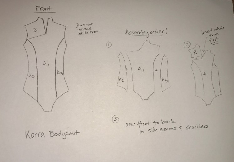 Korra’s Season 1 top was made with two pattern pieces, front and back (trim not included). Her Season 4 shirt is 5 pieces! The back is a single piece and the front is divided into four pieces.