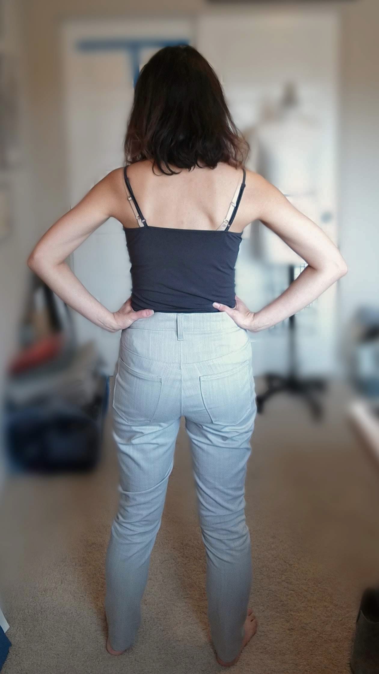 Some time passed after the above post from 2017 (technically I bought the fabric in 2014!). I attached the waistband to my wearable muslin…and when I tried them on again, it was clear the black twill “jeans” no longer fit. The waistband gaped and with the pants sitting where they should, I could tell that I needed to take in the center back seam a bit. But I managed to psych myself out (and then changed jobs) and it took me another 3 years to make an effort to alter these pants.